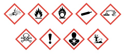 - Chemikalien, die als gefährlich eingestuft sind – erkennbar an den jeweiligen Piktogrammen und/oder Gefahrenhinweisen (H- bzw. EUH-Sätze),